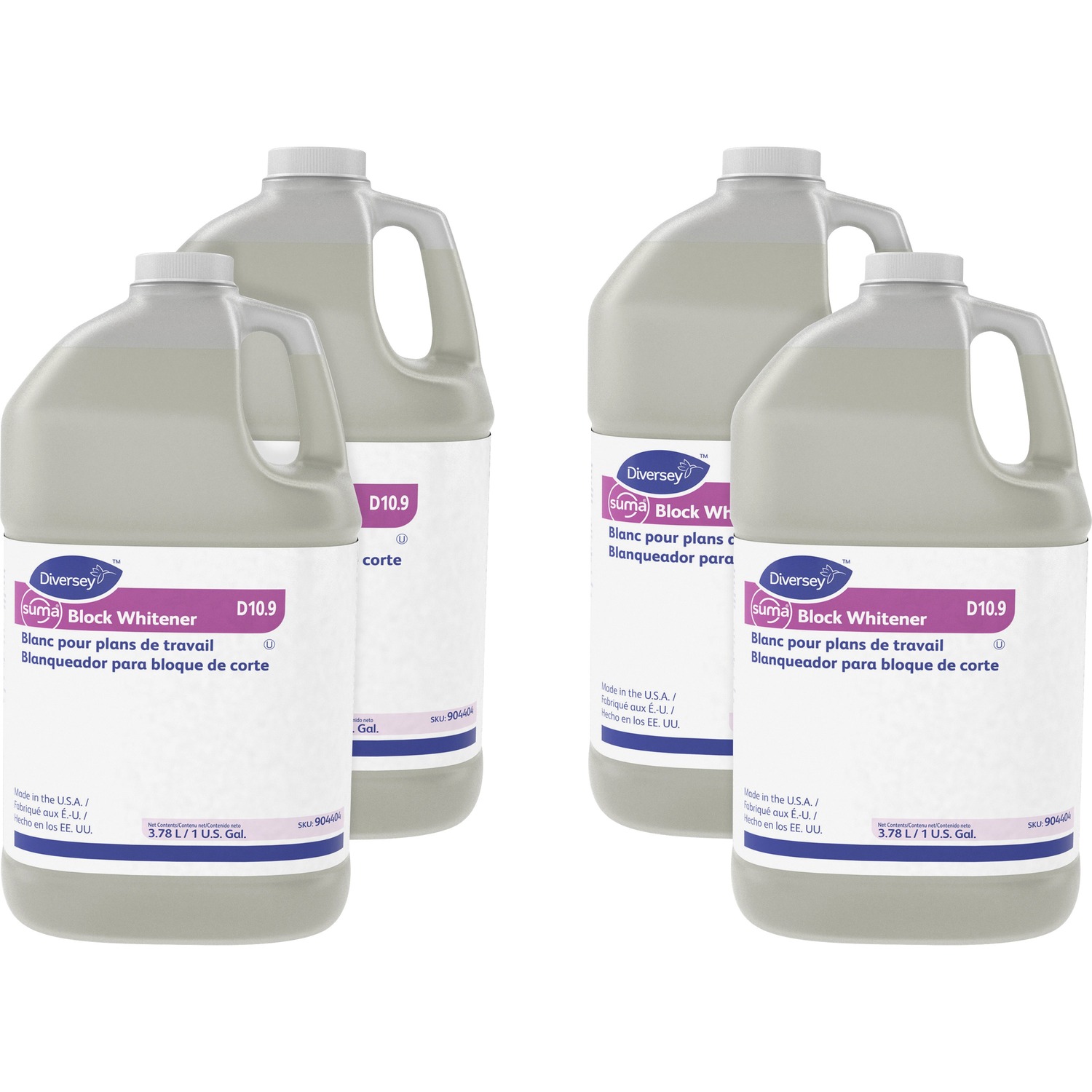 Specifically formulated for food cutting and preparation surfaces, Suma Block Whitener provides superior cleaning and whitening of cutting boards and other plastic surfaces. It is a high-alkaline, noncorrosive, RTU-thickened liquid. Thick liquid formula spreads easily over rough surfaces and allows even applications. It begins to work immediately upon application. It should be applied directly to the surfaces and used with a brush for deep cleaning. Powerful formula whitens and brightens cutting boards in as little as 15 minutes. Whitener meets DOT and OSHA noncorrosive requirements. It is pale yellow and has a chlorine scent.