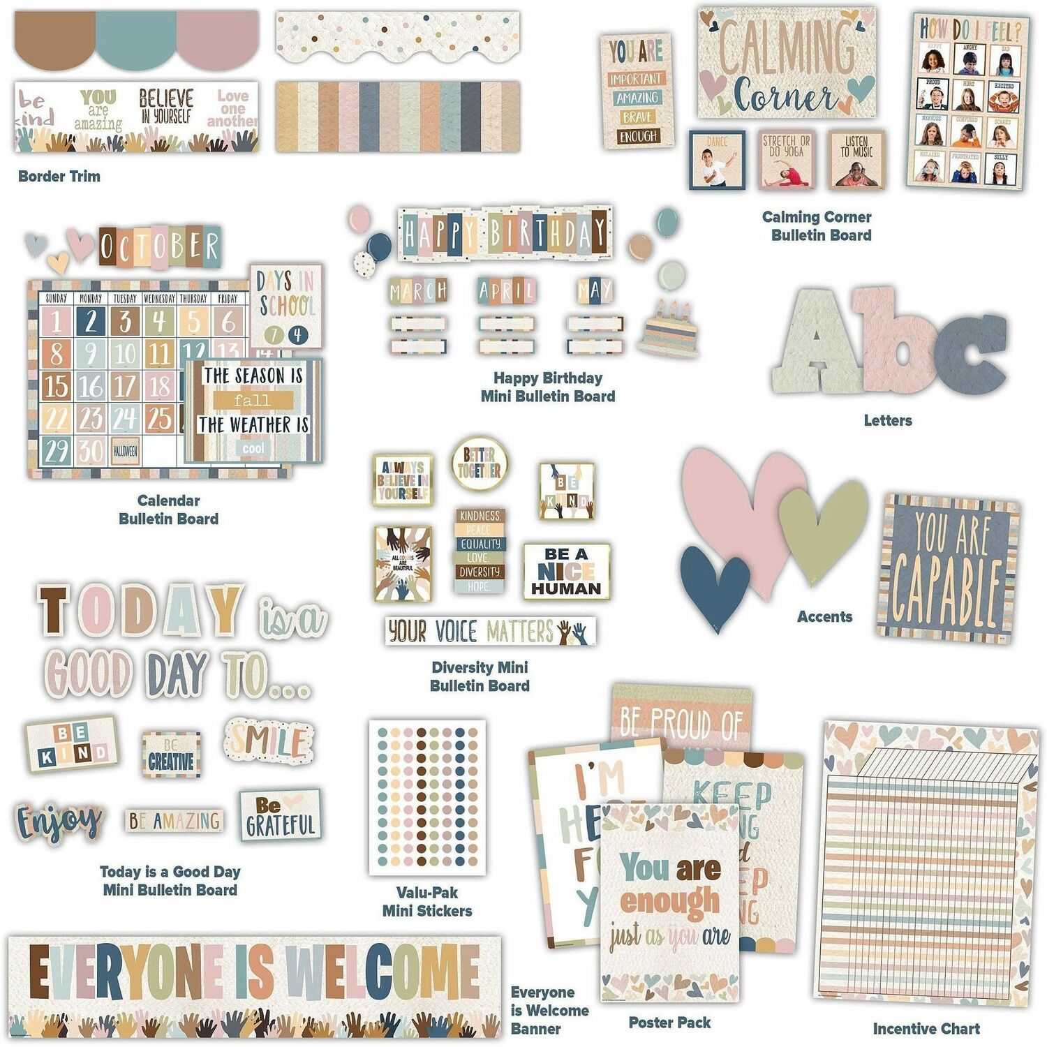 Everyone is Welcome Decor Set lets teachers decorate their classroom with subtle colors and inspirational messages. Creative theme promotes a positive learning environment that welcomes students. Wall decor includes bulletin board sets, accents, stickers, border trims, letters, posters and a banner.